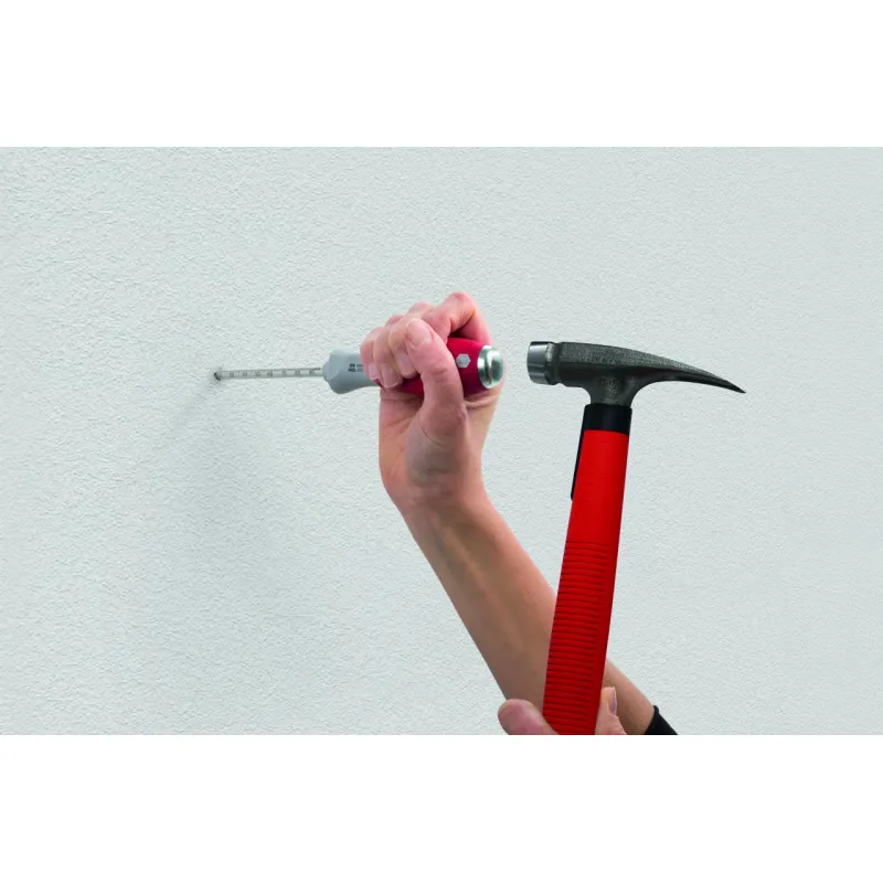 - В пробойнике отверстий под дюбель имеется больше, чем можно предположить с первого взгляда. Специальная внутренняя конструкция гальванически отделяет жало от стального набалдашника. Благодаря этому инструмент оптимально подходит для быстрого и простого пробивания отверстий под дюбель. Без перфоратора. Без грязи. Без длительного шума. Благодаря гальваническому разделению жала и стального набалдашника, человек, работающий с пробойником, всегда защищён, даже если он случайно попадёт в электрический провод. Профиль также оптимизирован в том отношении, что пробивка отверстий в стене происходит с минимально возможным дроблением. Нанесённая на жало шкала быстро и удобно показывает, насколько глубоко уже сделано отверстие. Мягкая зона эргономичной многокомпонентной рукоятки SoftFinish® состоит из приятного для ладони специального материала и удобно лежит в руке.